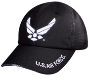 US Air Force Wing Mesh Back Tactical Cap features a raised embroidered Air Force lettering and ribbon on front panel. The tactical baseball style cap features 4 mesh panels and 2 reinforce air vent holes for maximum breathability and comfort. The Air Force Cap is one size fits most and fully adjustable with a hook and loop closure at the back.?˜