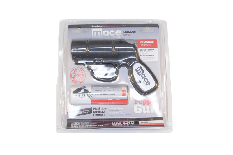 The Mace Pepper Gun is an innovative self defense spray delivery solution designed for long-range accuracy and re-usability. It is fueled by replaceable cartridges, making it completely reusable and allowing you to select different formulas to meet your operational needs. The cartridges feature Bag-In-A-Can technology for delivering continuous streams as well as short bursts, and its powerful stream dispersal pattern can hit targets accurately at ranges up to 25 feet. The gun also features a trigger-activated LED light, making aiming easier in low-light conditions and making it possible to dazzle an assailant. The package includes a 28 gram, 0.74 percent capsaicinoid pepper cartridge, a water cartridge for safe practice, and batteries for the LED light.