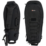 Main padded single rifle compartment. Rigid hook & loop lockdown strap. Adjustable barrel sleeve. Hook & loop molle panel for custom configuration. Full length removable padded divider. Lays completely flat when opened. Concealed front cover. Quick front pouch. Ambidextrous configurable shoulder strap. 600d polyester exterior & interior shell. Woven cinch straps. Durable side release buckles. Lockable zippers. Double-stitched seams. Morale patch panel. Quick-access pull handles.