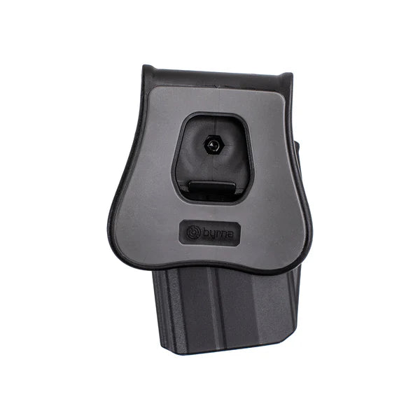 - RETENTION DEVICE: The Level II Holster features a built in retention device that uses the launcher trigger guard to secure your Byrna in the holster. Simply depress the button to draw safely and securely.