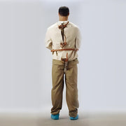 INSTRUCTIONS:Make sure the belts on the back of the jacket are unbuckled. Put the jacket on so that the belts are in back. Pull the short leather straps through the corresponding loops on the other side of the back of the jacket, pull tight, and loop the end of the strap back through the buckle and keeper. Use this same procedure for all three back straps. Then cross the arms in front and use the arm strap to attach the sleeves to each other in the back using the grommet holes.