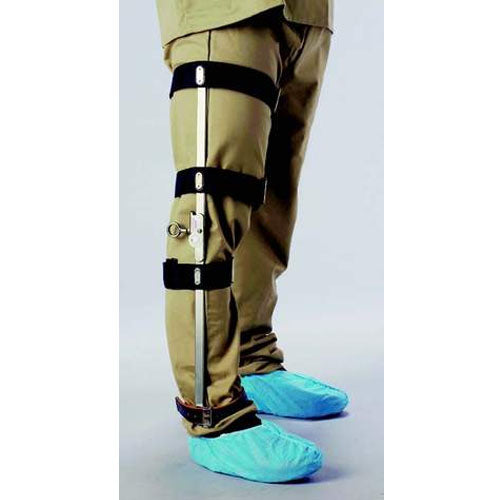 Unique to Humane Restraint, the LAB-100 impedes running and kicking. It canbe worn under clothing making it idealfor jury trials and airline travel where adiscrete restraint is needed. Three nylonstraps close with hook and loop for fast application and removal. A fourth strap, locking and made of heavy duty leather, provides extra security. Rugged steel upright has hinged knee with a springloaded pin that will maintain brace in upright position until released with lever.