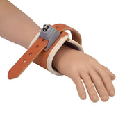 Then take one wrist and put it into the open wrist cuff, wrap the cuff around the wrist, and fit to the appropriate size adjustment. Follow L-300 locking procedures on the locks and keys spec sheet to secure the lock. Use this same procedure to secure the other wrist.