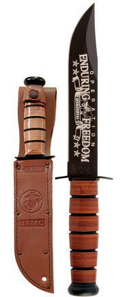 This knife has been laser engraved with carefully designed blade art meant to honor those men and women who served in Afghanistan. Tang stamped USMC. Leather sheath included.