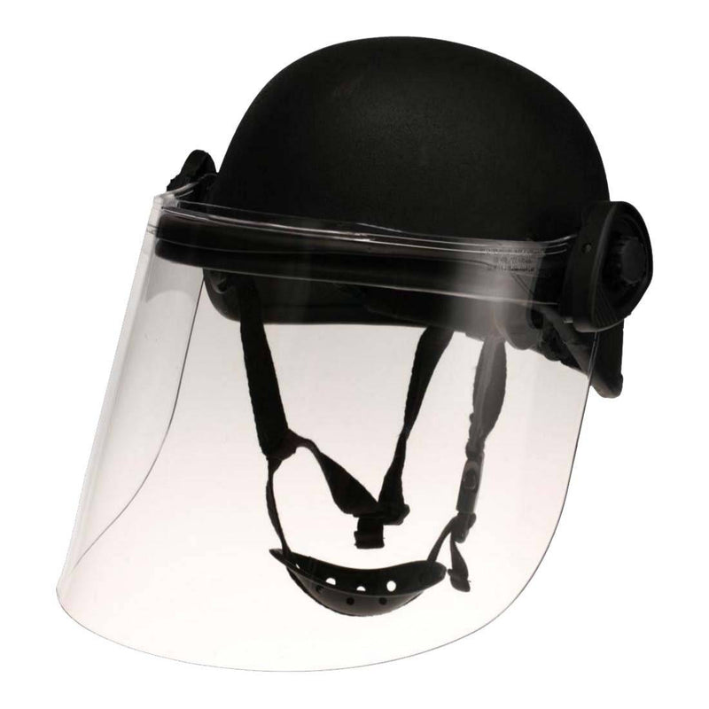 Field-mount riot face shield designed to fit most PASGT combat helmets with front-brim (not including helmets w/ rails). Integral rubber seal provides protection from liquids. Optically correct lens.