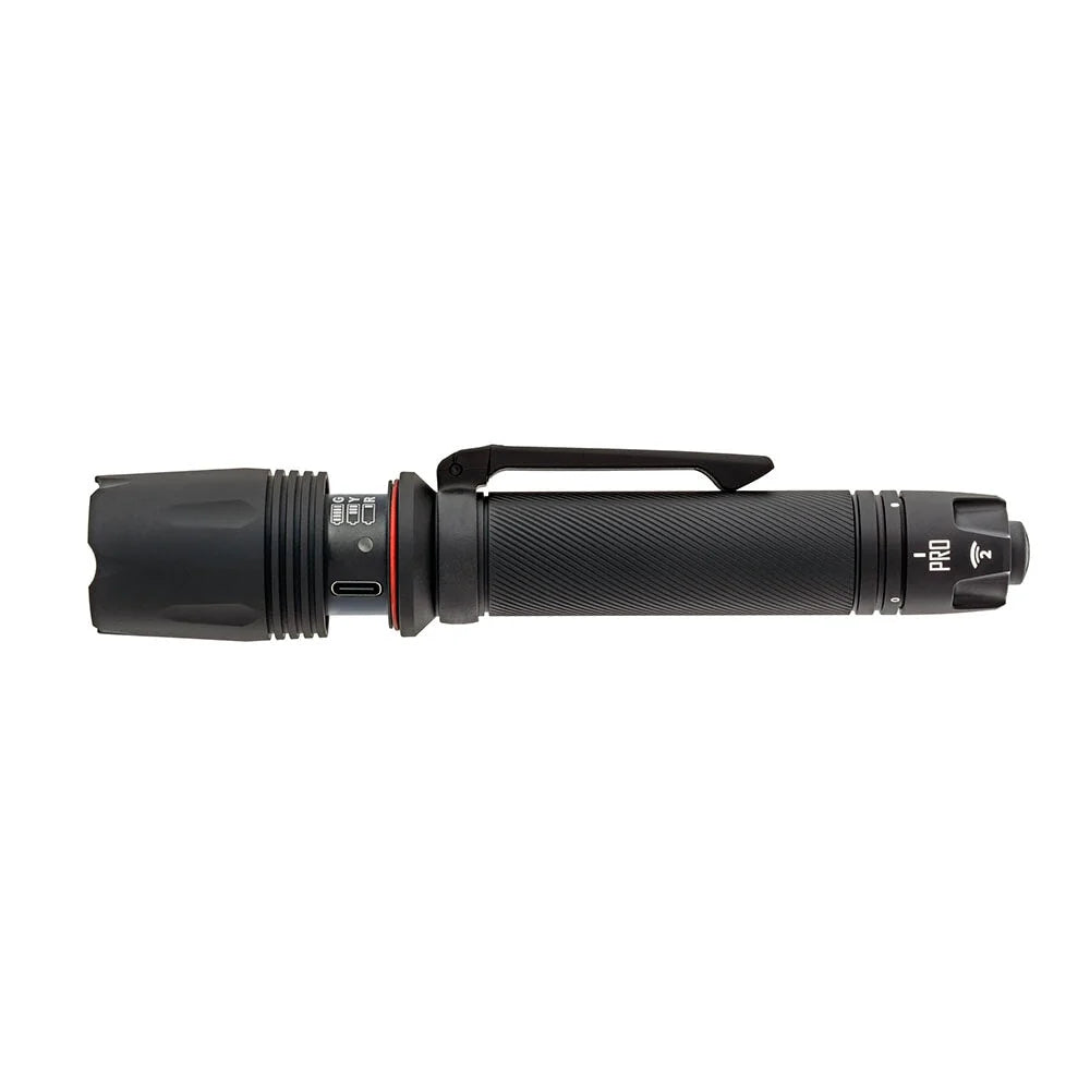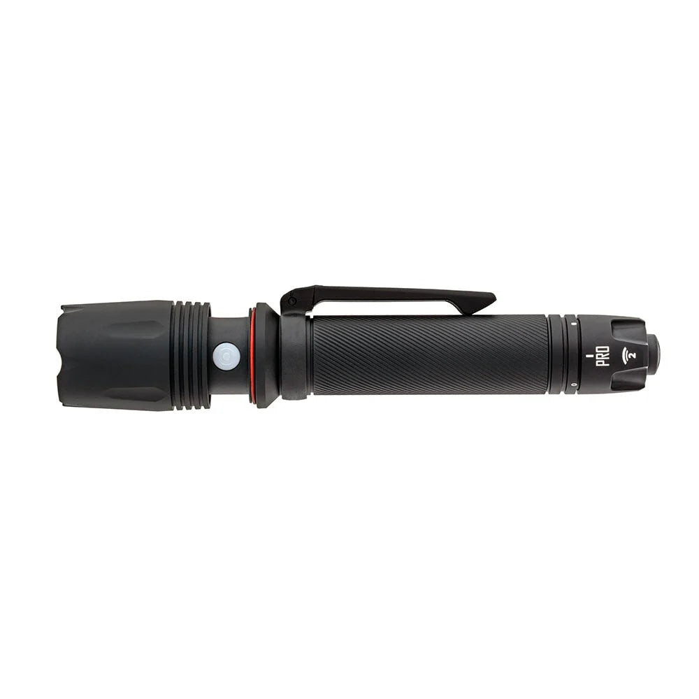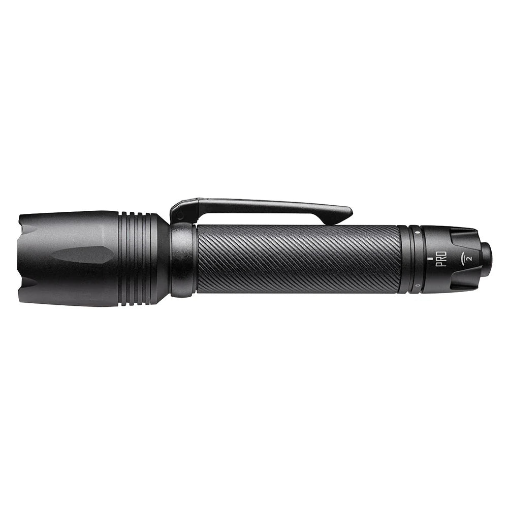 The Pro flashlight boasts a primary-setting brightness of 600 lumens, with a secondary light level that’s user-programmable at 15, 75, or 150 lumens, or strobe. In keeping with our emphasis on intuitive design and simplicity in our law enforcement tools and training, activation of the Pro light is via a single pressure switch on the tail cap—press once to activate the primary/max setting, twice to activate the user-programmed secondary mode. A 3-position rotary selector on the tail cap allows choice of intermittent activation, constant-on, or lockout. Setting the secondary mode takes just seconds―simply twist the bezel open to activate programming mode, tap through the levels until you reach your chosen setting, and twist the bezel closed to lock it in.