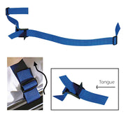 INSTRUCTIONS: Lay both pieces of webbing flat. Take the webbing piece with the buckle on one end and lay it on the bed, positioning the buckle in the middle of the bed. Loop the other end around the bar you wish to attach it to by first feeding under the bar and then over the top to reach the black slide.