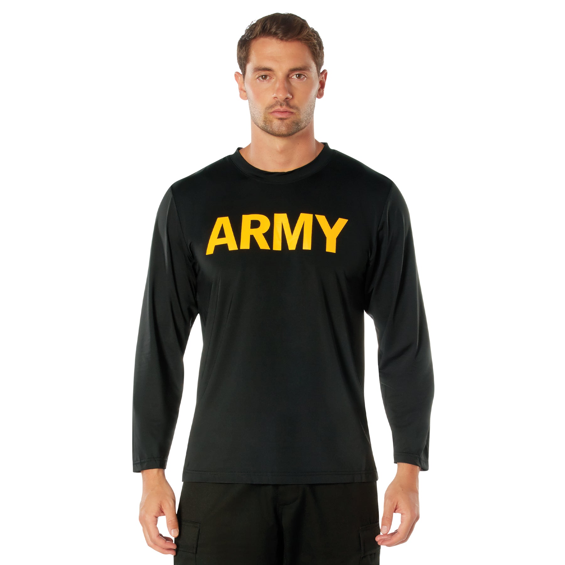 Lightweight and Comfortable. Army PT Long Sleeve Shirt is a new and improved version of the traditional military physical training shirt . PT Shirt is constructed of a Nylon/Spandex performance material that is breathable and will wick away moisture. Gold "ARMY" lettering is printed across the chest. Complete the uniform with matching Army PT Shorts!