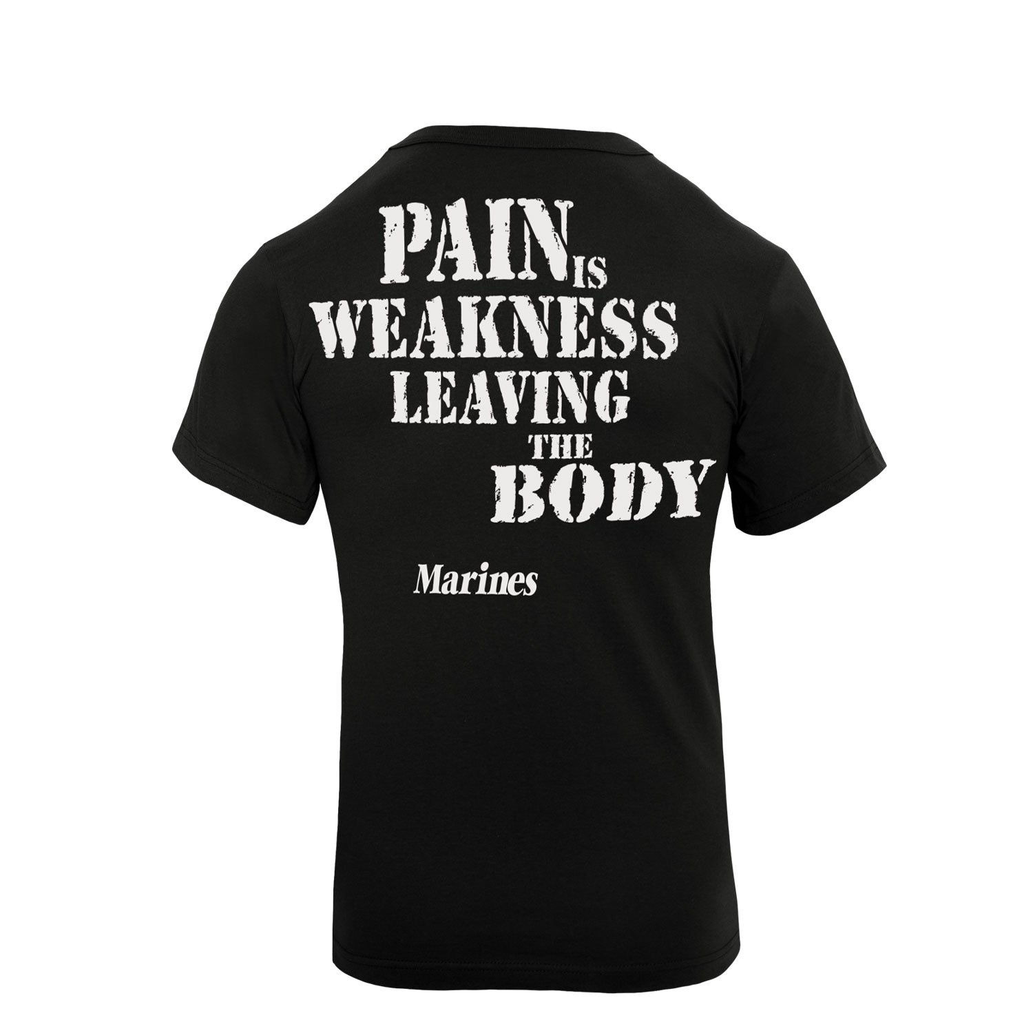 Officially licensed by U.S. Marines "Pain Is Weakness Leaving The Body"?ÿ T-shirt features a two-sided print with a Marines logo on the front chest and ƒ??Pain is Weaknessƒ?� slogan on the back.?ÿ