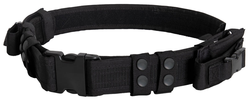Tactical Duty Belt is constructed of a heavy-duty material to ensure stability and reliability while holding the weight of your professional gear. The police belt is also fully adjustable comfortable fitting most waist sizes.?ÿ Hold public safety items such as your firearm, handcuffs, and other uniform gear. The belt is equipped with two removable pouches with hook & loop closures that are ideal for storing folding knives or other small security items.?ÿ The 2" wide quick release buckle allows for easy removal. Tactical belt fits a 48" waist at the largest and 29.5" at the smallest.?ÿ Tactical belt is ideally worn by police, military, public safety, and law enforcement personnel.?ÿ