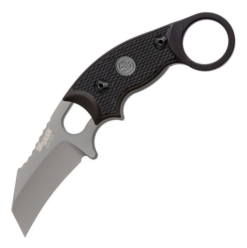 FEATURES SIG SAUER Firearm Match: Tactical Grey Cerakote SIG Medallion Frame: Solid Black G10 Scales with Mini Piranha Texture Quick-deploying, super tough nylon belt sheath with rotating belt clip Boltaron knife neck sheath with paracord Eyelets compatible with Tek-Lok attachment systems