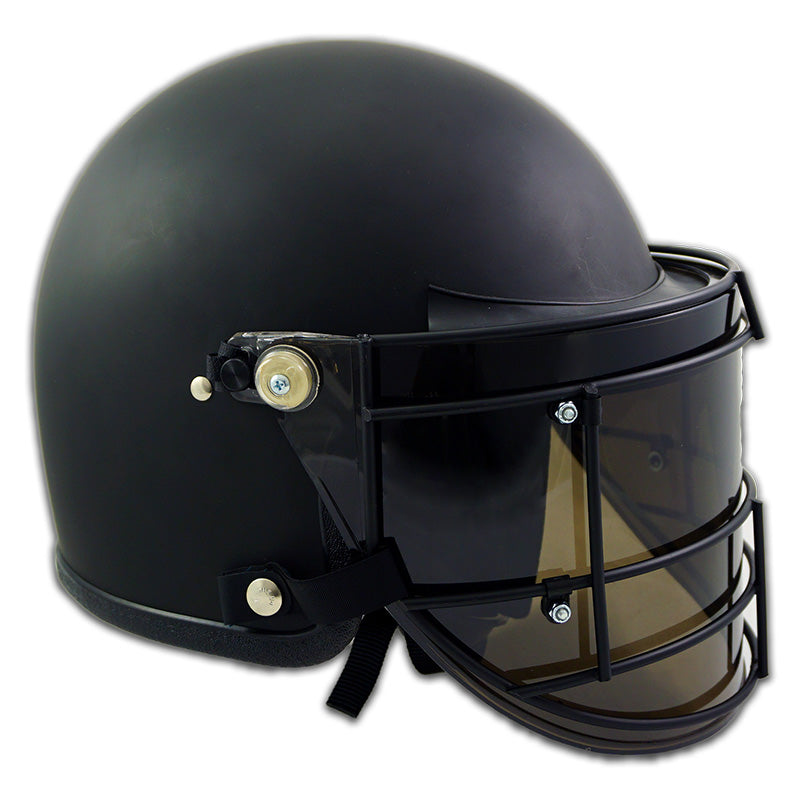 RIOT FACESHIELD: MODEL S1611FG Maximum coverage and protection, injection molded high-impact polycarbonate face shield. Optical grade .100 inches thick. Easily adapts to Gas Mask use age. The face shield allows full 90°rotationwithacam-actionpivot, incorporating full up to full down with a positive lock in either position. Face shield is held firmly in place and replaceable by means of metal aluminum band, spring steel clip and thumb screws. The face shield incorporates a neoprene seal to provide a liquid seal between the face shield and the helmet. The edges of the Face shield shall be a smooth rounded edge. The FG Model has the addition of a heavy # 9 wire faceguard affixed to the exterior of the face shield for forced cell entry duty and optional tie-downs to secure in the down position. Face shields are replaceable in the field and meet or exceed the requirements of Z87.1, VESC-8 and NIJ0104.02.