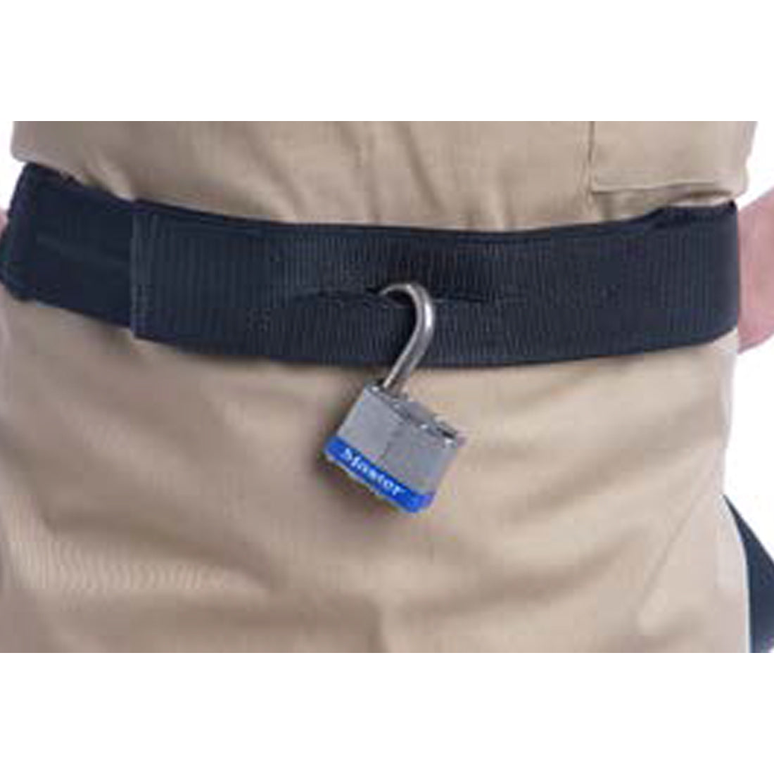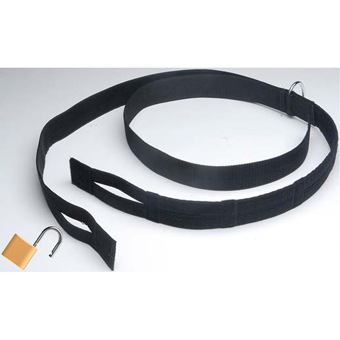 INSTRUCTIONS: With restrained person's hands cuffed, wrap the belt around the waist. The double loop belt section should be placed between the two hook belt sections. Then simply close the belt handcuff on the center section of handcuffs on the person. Secure waist belt with a padlock through slots for extra security.