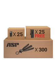 - 300 Tri-Fold Restraints: As the name suggests, the straps of the lightweight ASP Tri-Fold disposable restraint fold in three places, for ultra-compact storage on a belt or vest. When deployed, they provide wide open loops for fast and easy application. The straps are extra-wide, with smooth edges for safety, and run through a fully-enclosed ratchet block with a shim guard to prevent picking. Tightening the restraint is quick and positive, using either the included molded pull ring or optional, extra-long flex pull cord. Once tightened, squeezing the secondary compression lock buttons provides additional security. The Agency Set includes enough Tri-Folds to fill and refill the included cases a dozen times; ASP’s custom polymer formulation makes them shelf-stable for long-term storage of the backup supplies.
