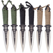 The UZI UZK-TRW-006 Throwing Knife VI features (6) straight edge, stainless steel blades and nylon wrapped handles. This model offers black and silver blades, olive drab, black and tan lanyard-wrapped handles, and are perfectly balanced for accurate throwing. The blades themselves are printed with the names of ancient Japanese Samurai clans, which gives the knives a very unique and authentic look. The set also comes with a nylon sheath that holds all six knives. UZI combines advanced technical concepts with innovative designs to produce products used and trusted by the Army, Secret Service and Special Forces. Since its launch in the 1950s, UZI has become one of the worlds most famous firearm brands and a 20th century icon.