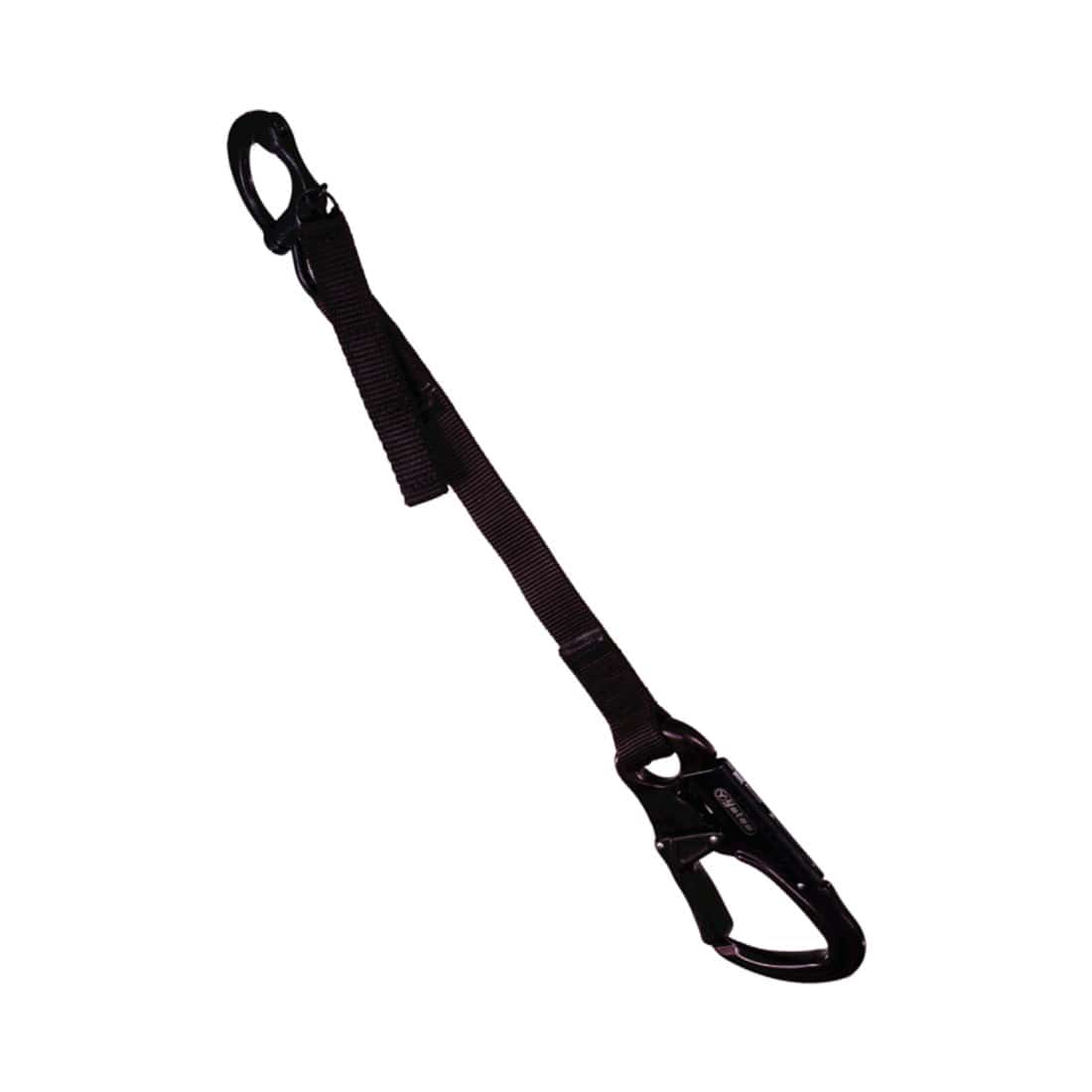 For use as a personal retention lanyard in a helicopter. Helo Personal Retention Lanyard without retraction bungee inserted in webbing. Designed using the first all black, non reflective, oxide plated quick release shackle made of stainless steel by Ronstan. Oversize quick release shackle allows the user to easily release from harness or belt in the event of an unplanned landing. Swedged release pin (SOCOM requirement) eliminates plunger pin from releasing in the event the retaining ring is broken. Retaining split ring is safety TIG welded. Quick release shackle uses velco to secure the release tab in place to lessen the chance of inadvertent release. Built with 4000lb. mil spec 5625 tubular webbing. Lanyard rated strength 3400 lbf. (15kN). Kong Tango double locking snap hook is classified to meet NFPA 1983/2006 edition standards. Strength 7425 lbf. (33kN). Made in USA.